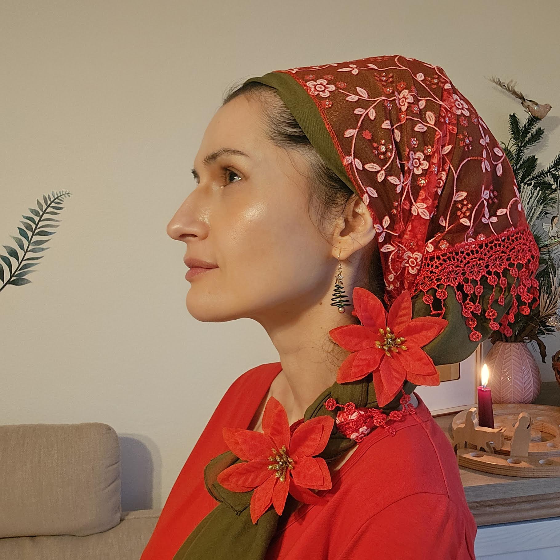 I have the Dreamy Lace in white and I love it! It’s sparkly on one side (a nice surprise!) and is very delicate and see-through yet sturdy. It can dress up any wrap with just a tad of lace overlay with or without tails and tassels EVERYWHERE! Bam! Elegant fanciness! However, I also like to tone it down and simply drape it over my head for church like a mantilla: