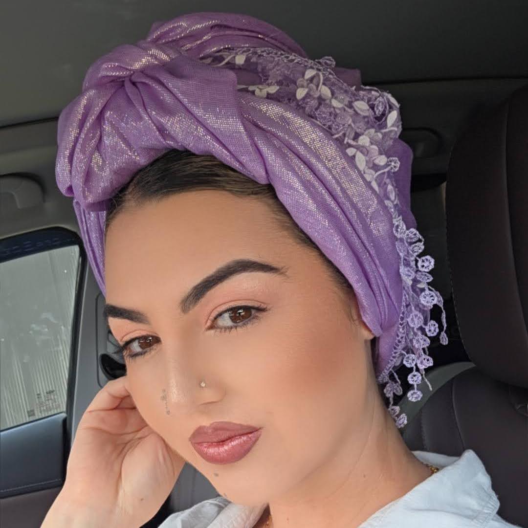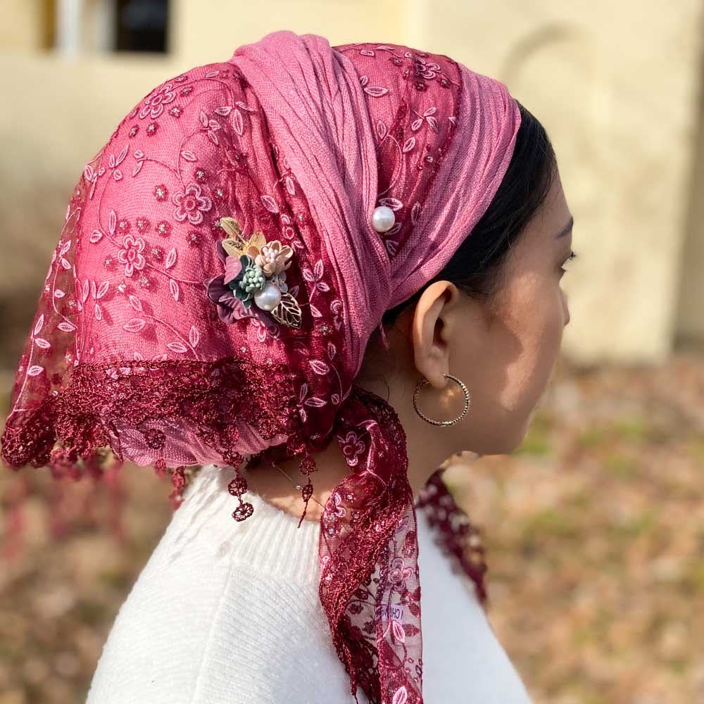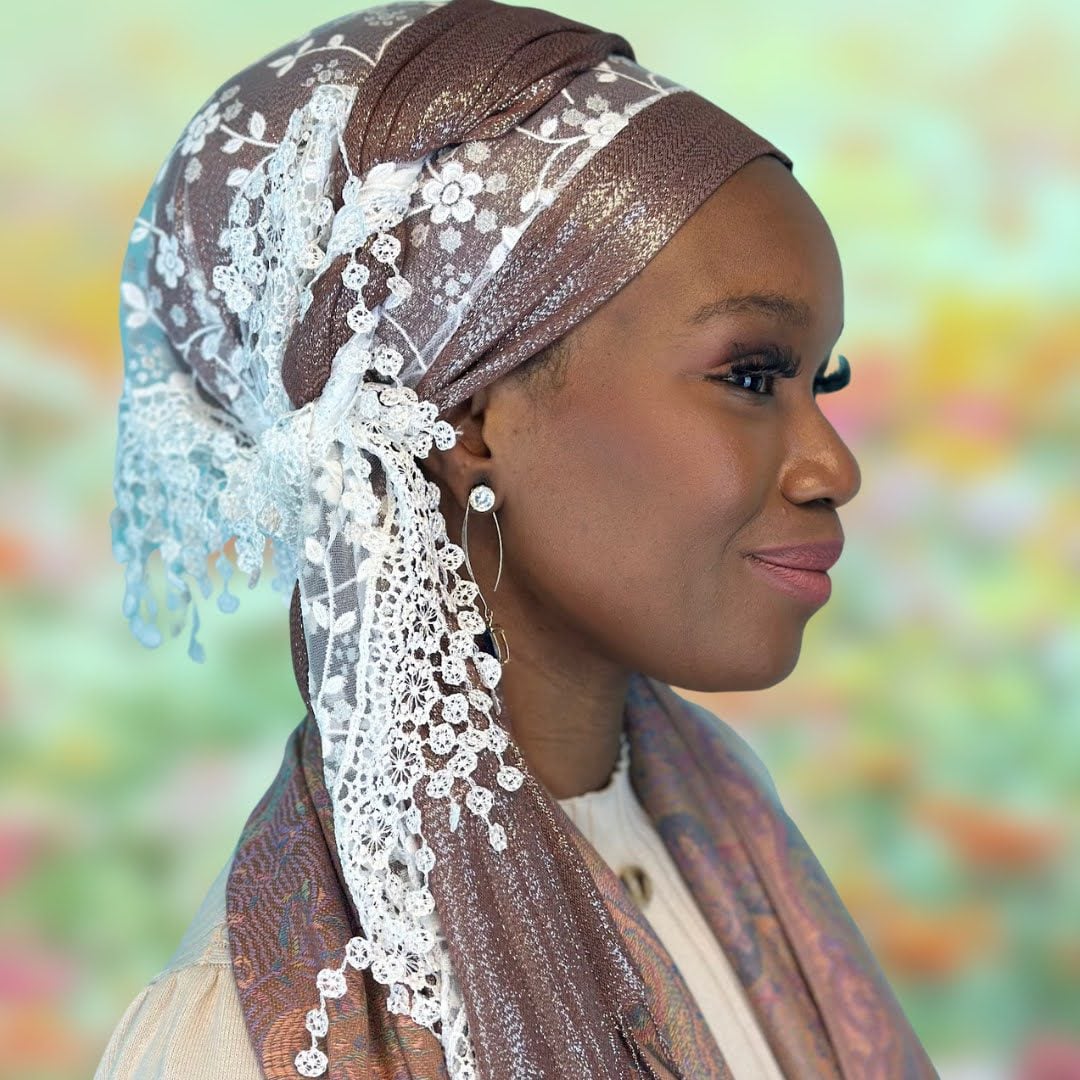 Our Dreamy Lace Scarves are triangular and much smaller than our usual rectangles. In order to use one with a shaper and have the bottom of the lace reach to tuck in at the nape of your neck, you’ll need to place it farther back on your head. It also makes for the most amazing veil style! These gorgeous, sheer daisy lace scarves pair perfectly with either a complimentary OR contrasting scarf – use them as a pop of color or as a delicate accent. The fringe is just awesome left hanging on its own, or it can be brought up or braided. We know you’ll find tons of ways to wear it!