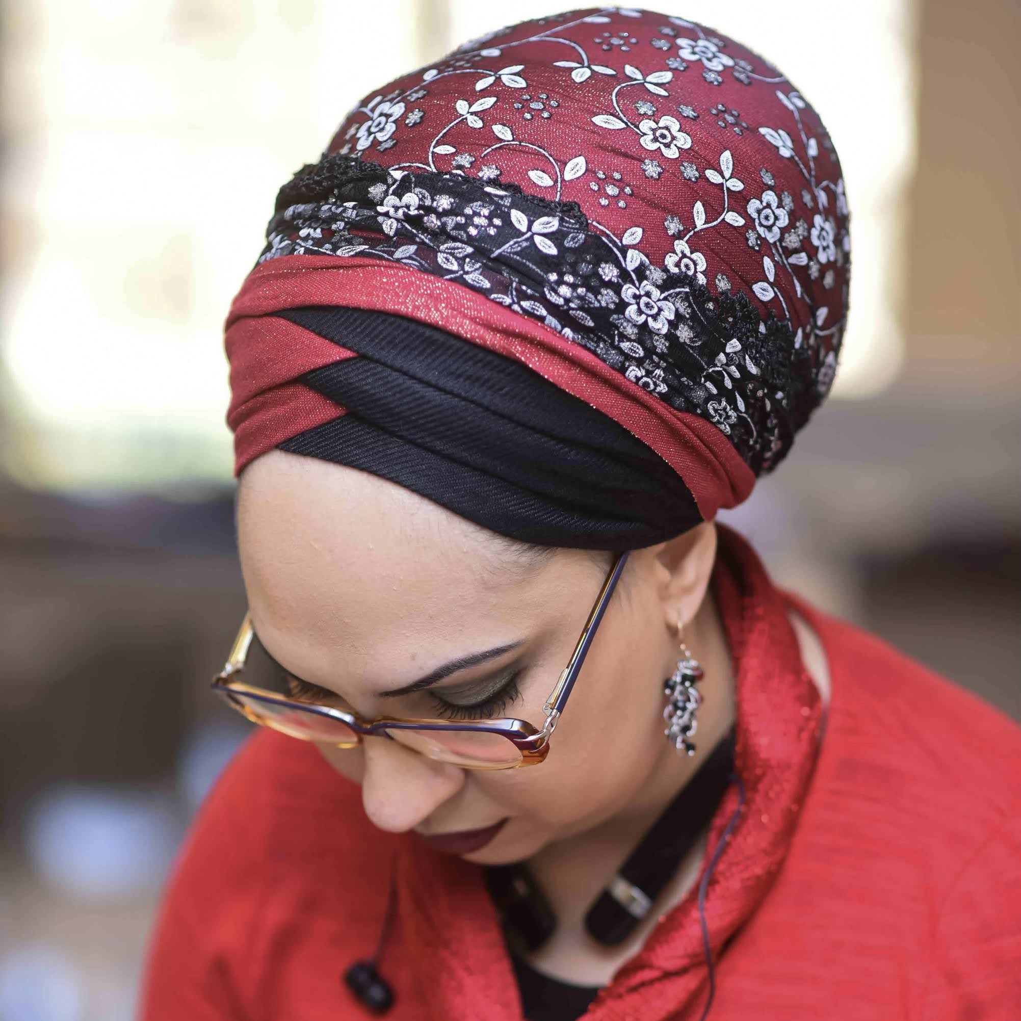 This is one of my favourite lace tichels from Wrapunzel. It is very elegant and while it is perfect for the most formal wraps, it can just add that extra bit of special to every day wraps.