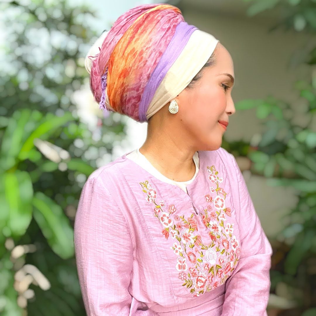 I was hesitant to buy this because I was afraid that it would not be long enough for me to wrap properly. But I took a chance and got the one in taupe/seafoam/orange. And here I am wearing it in chignon. Yes, it’s long enough for my favorite basic wraps. The print and color mix are awesome.